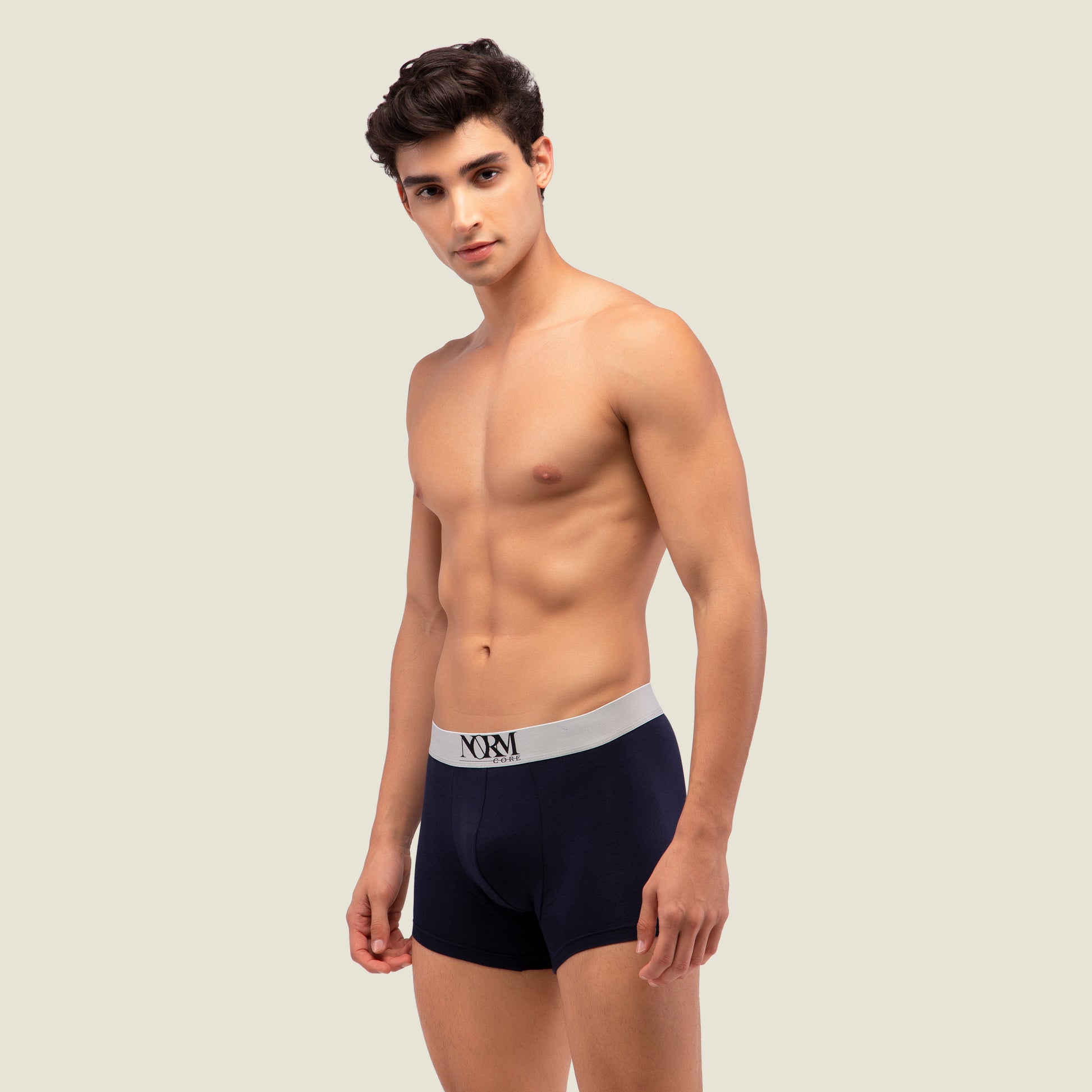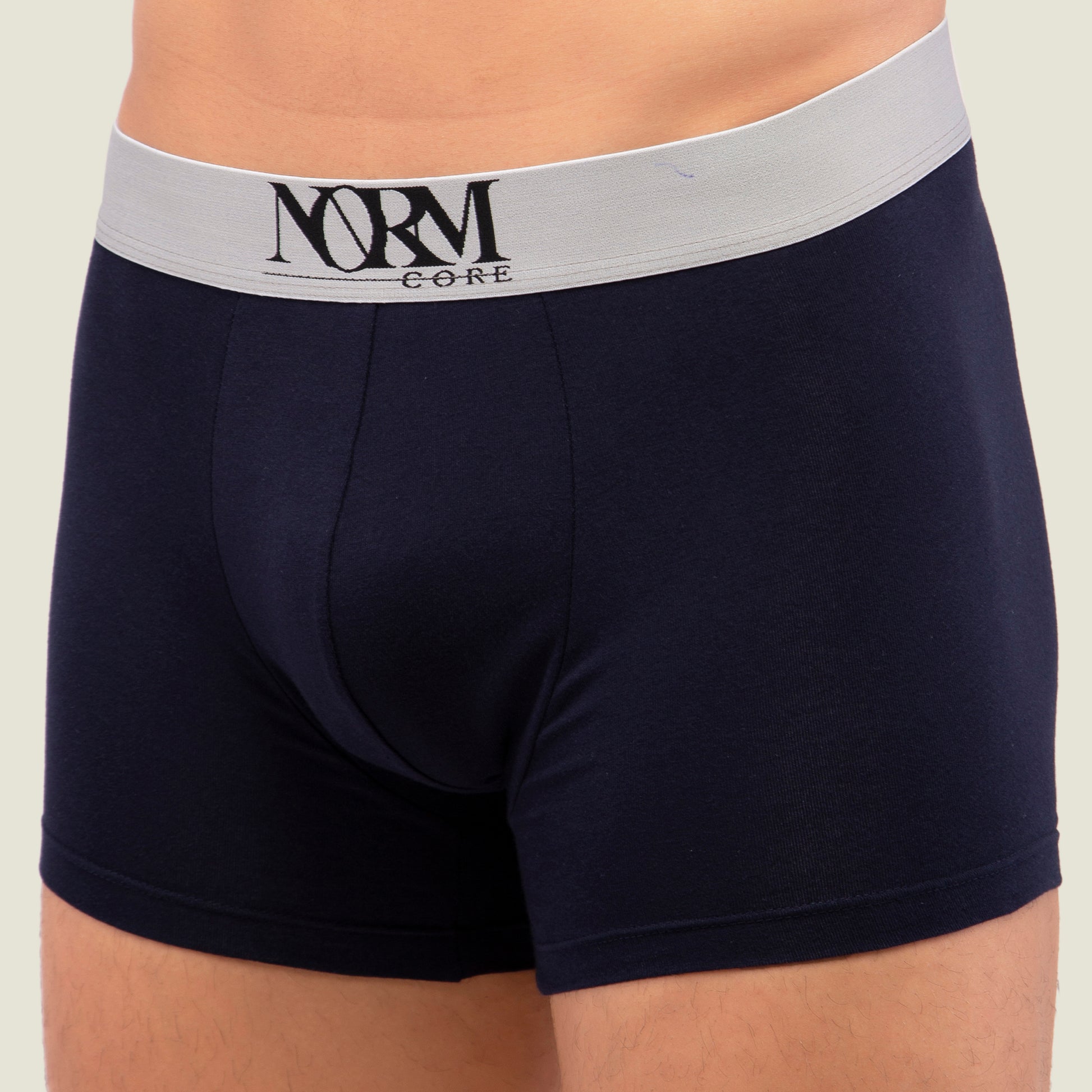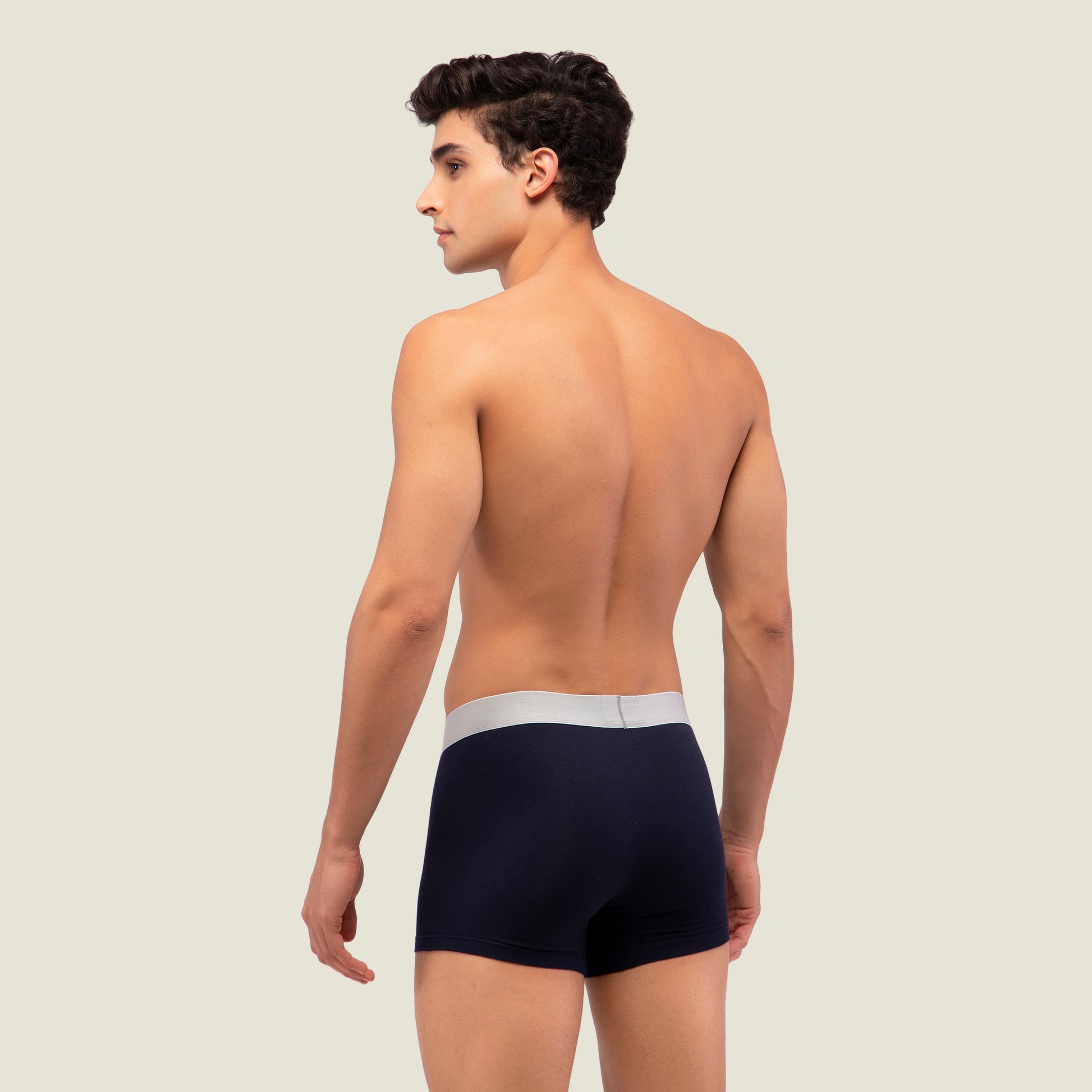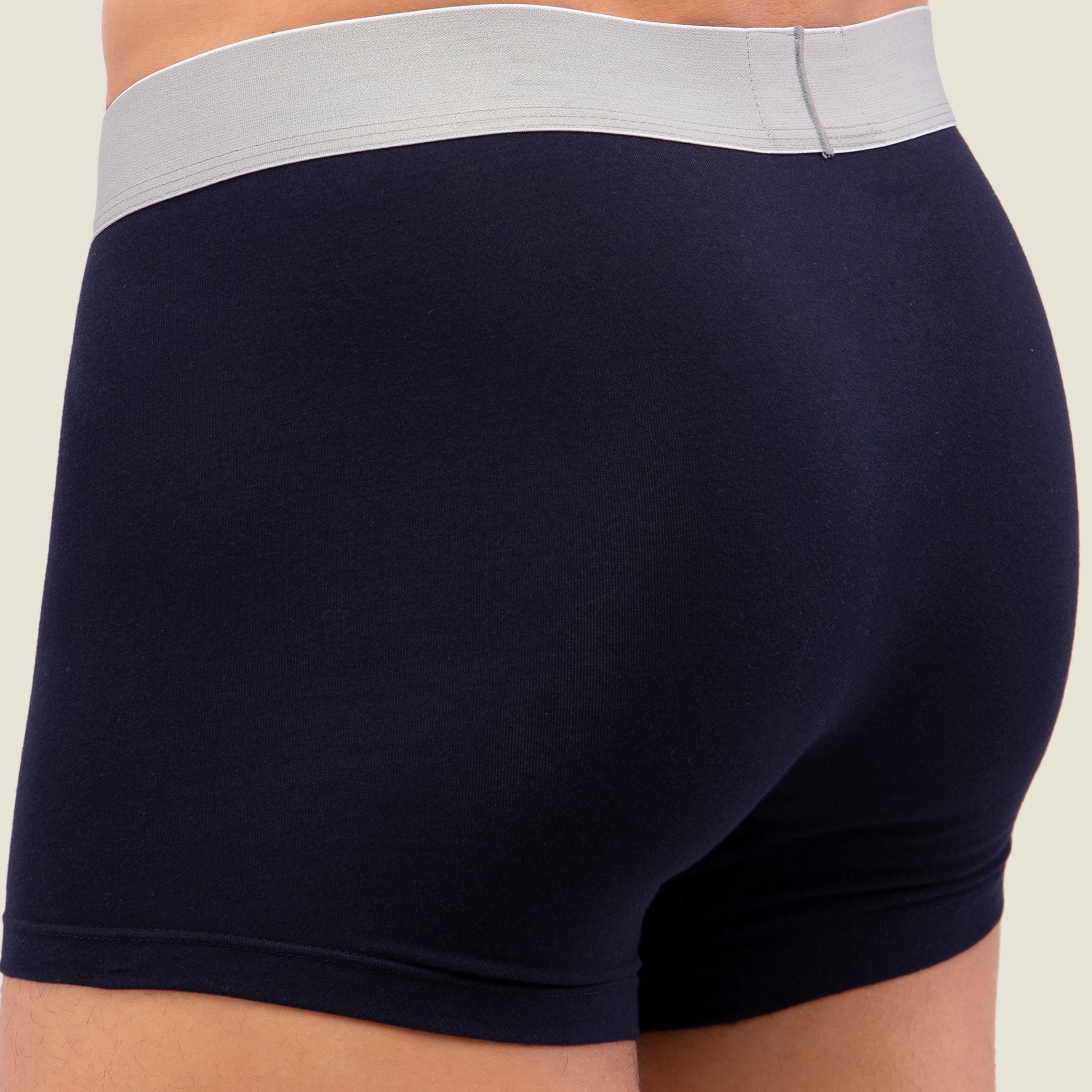 - Solid navy blue trunk with silver elasticised waistband for men. A timeless look created by the fine combination of silver and navy blue. It possesses exceptional qualities such as superior comfort, good hygiene and excellent fit.