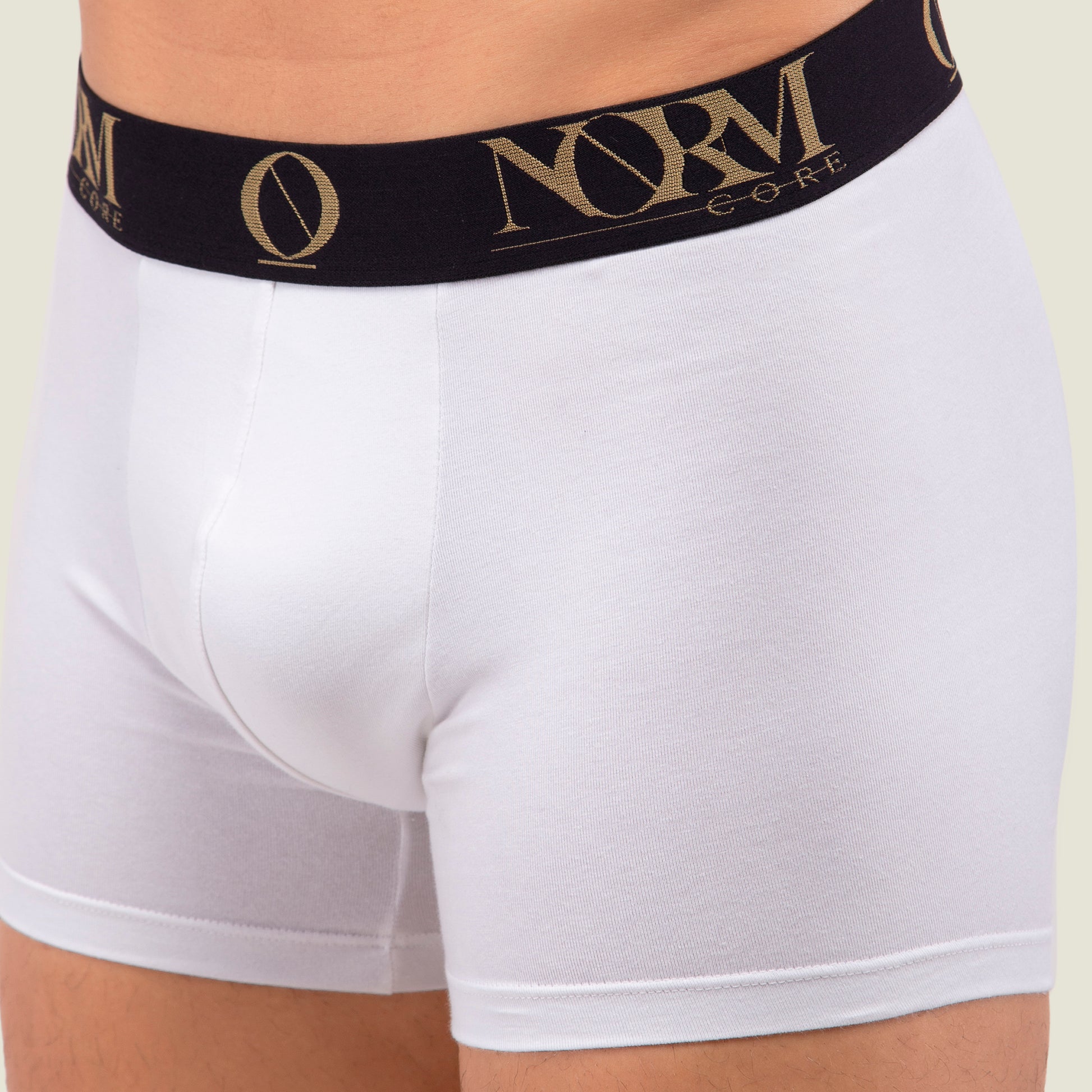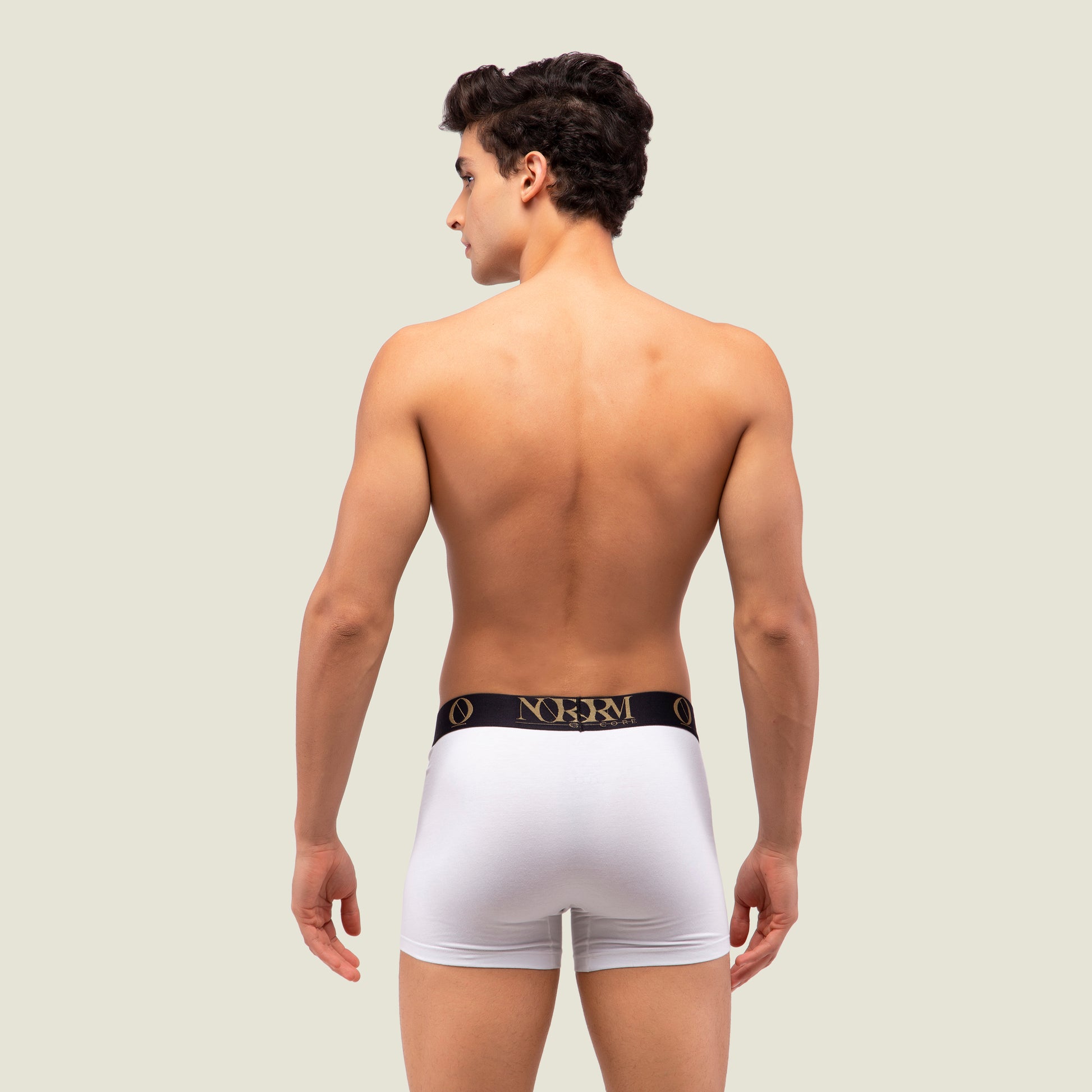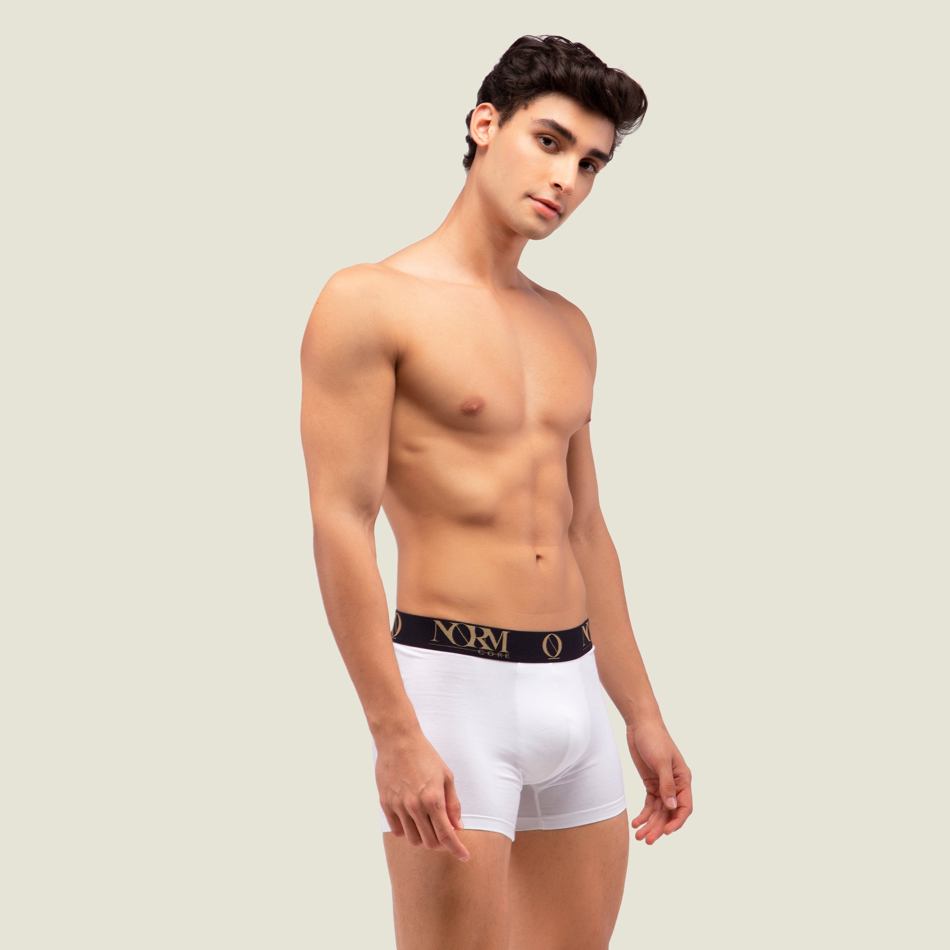 Solid white trunk with gold elasticized waistband for men.The contrasting combination of white and gold is visually very captivating.Experience impeccable comfort and an exquisite fit.